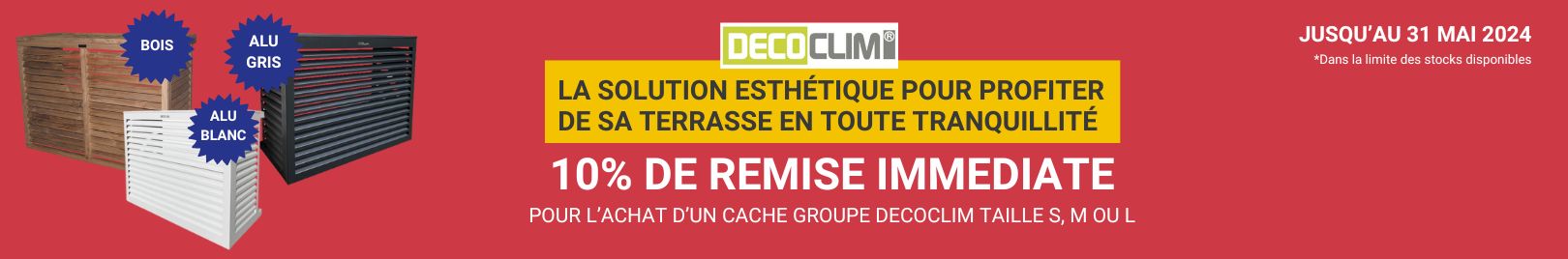 Du 1er au 31 mai 024, bénéficiez d'une remise exceptionnelle de 10% sur l'achat d'un cache groupe DECOCLIM taille S, M ou L, sur une sélection de produits : 051008-100030, 051008-100031, 051008-100032, 051008-100300, 051008-100301, 051008-100302, 051008-100400, 051008-100401, 051008-100402. Cette offre exclusive est une occasion unique d'optimiser l'esthétique des installations de vos clients tout en réalisant des économies.