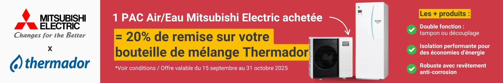 1 PAC Air/Eau Mitsubishi Electric achetée = -20 % sur votre bouteille de mélange Thermador 50 L + 2 bouchons offerts