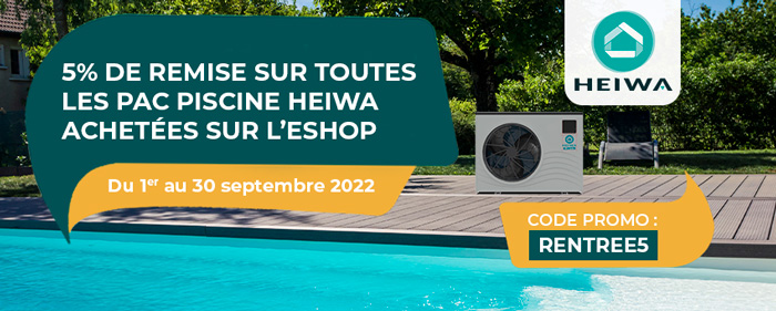 Du 1er au 30 septembre 2022, pour tout achat d'une PAC Piscine Heiwa sur l'eshop, profitez d'une remise de 5% immédiate avec le code promo : RENTREE5 ! Et oui, à la rentrée on continue les économies !
