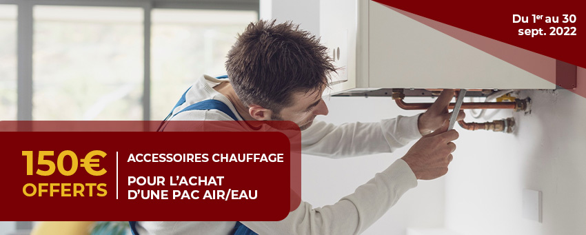 Conditions d'utilisation : Valable en uniquement en agence du 1er au 30 septembre 2022, sur toutes les PAC air/eau et accessoires de chauffage. Offre non cumulable. Pour un montant minimum d'achat d'accessoires chauffage de 150€HT. Dans la limite des stocks disponibles.