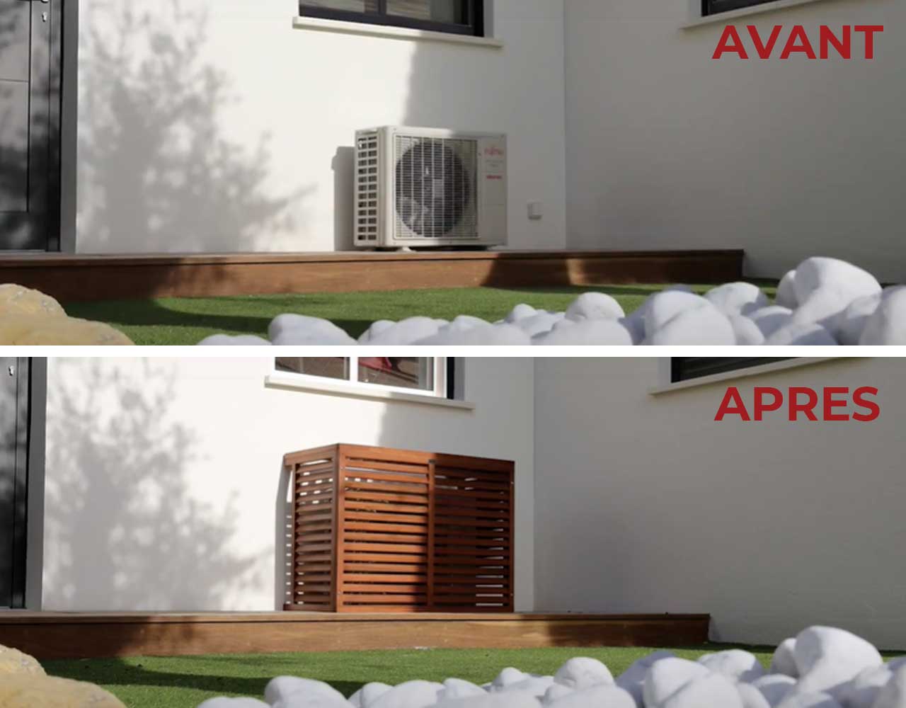 Dissimulez les climatiseurs et les pompes à chaleur chez vos clients grâce à la gamme de cache-groupe DECOCLIM®.