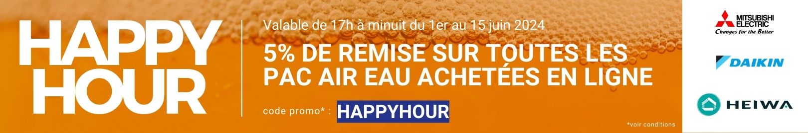 Du 1er au 15 juin 2024, profitez de notre offre exclusive web pendant notre happy hour de 17h à minuit ! Nous vous offrons 5% de remise immédiate, avec le code promo : HAPPYHOUR sur toutes les pompes à chaleur Air/Eau des marques Mitsubishi Electric, Heiwa et Daikin. Cette promotion est spécialement conçue pour vous, les installateurs du CVC, afin de vous permettre d'acquérir du matériel de qualité à un prix encore plus compétitif.