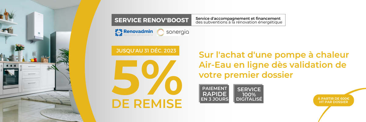 Grâce à notre nouveau service Renov'boost bénéficier d'une remise exceptionnelle de 5% sur l'achat d'une pompe à chaleur Air-Eau. Cette offre avantageuse est disponible dès la validation du premier dossier.