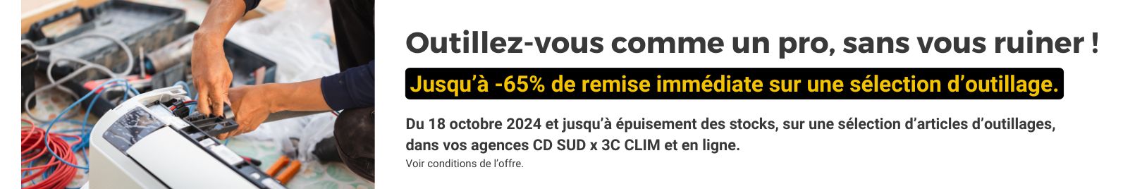 Profitez d’offres exclusives sur l’équipement frigo et l’outillage essentiel pour vos projets de génie climatique ! Jusqu’à -65% de remise immédiate sur une sélection d’outils de qualité professionnelle, valables dans nos agences et en ligne à partir du 18 octobre.
