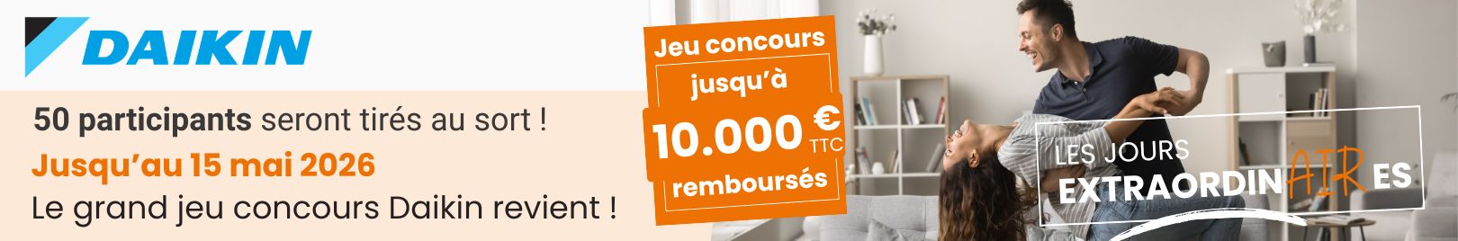 Le principe est simple : pour l’achat et l’installation d’un équipement Daikin éligible, vos clients particuliers peuvent participer à un jeu concours avec remboursement pouvant atteindre 10 000 € TTC.
