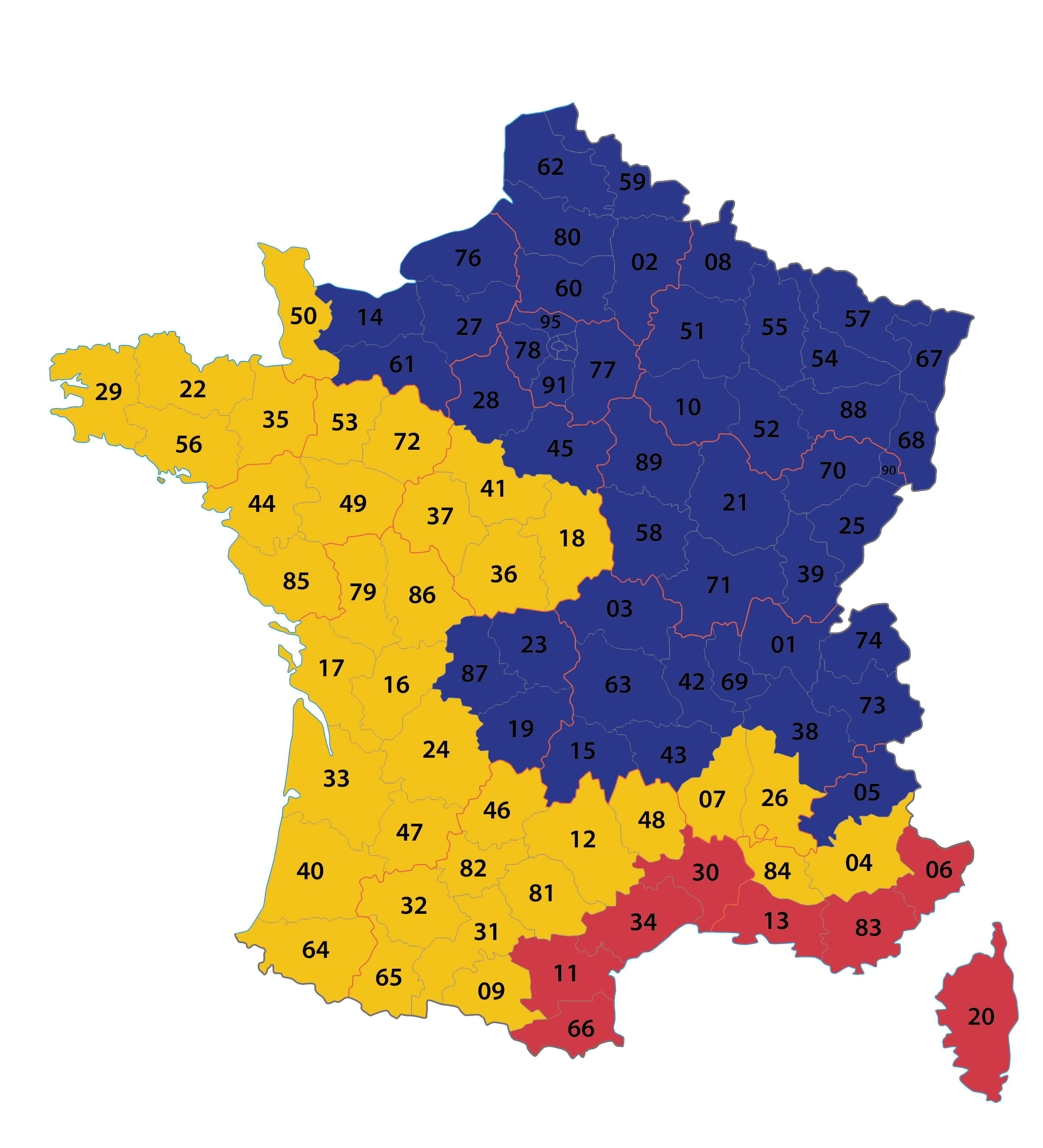 Zone 1 en bleu | Zone 2 en jaune | Zone 3 en rouge