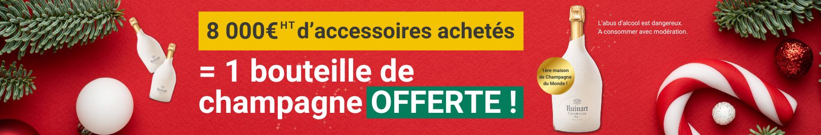 En cumulant un achat de 8 000 € HT d’accessoires, vous recevrez une bouteille de Champagne Ruinart. Pour 16 000 € HT, vous pourrez profiter de deux bouteilles offertes, ajoutant une touche festive à vos projets réussis.