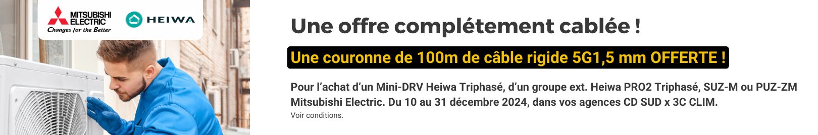 Pour bien terminer l'année, CD SUD x 3C CLIM vous propose une offre exclusive réservée à nos agences : du 10 au 31 décembre 2024, pour tout achat d’une machine parmi notre sélection Heiwa et Mitsubishi Electric, repartez avec une couronne de 100m de câble rigide 5G1,5 mm offerte (réf. 050301-D00016).
