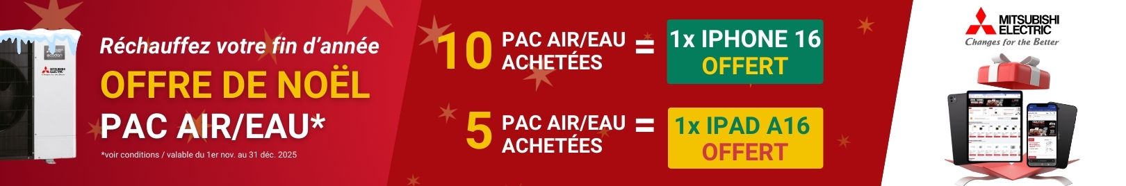 1 iPhone 16 ou 1 iPad A16 offerts pour l’achat de vos PAC Air/Eau Mitsubishi Electric !