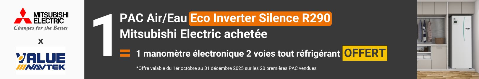 1 PAC Air/Eau Mitsubihi Electric Eco Inverter R290 achetée = 1 manomètre électronique 2 voies Value OFFERT