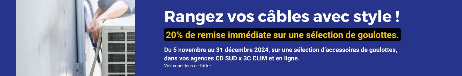 Conditions d'utilisation : Offre valable du 5 novembre au 31 décembre 2024, dans la limite des stocks disponibles et sur une sélection d'accessoires goulottes. Dans les agences CD SUD x 3C CLIM et en ligne.