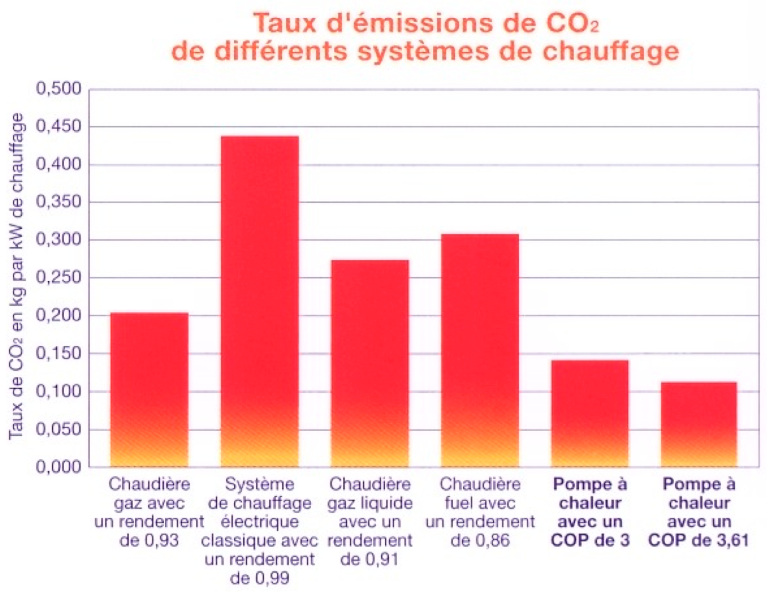 Le chauffage représente plus de la moitié des émissions de CO2 d'un logement. C'est pourquoi le gouvernement Français encoure les investissements dans les systèmes de chauffage écologiques comme la pompe à chaleurEn effet, une pompe à chaleur à COP élevé rejette environ 50% de CO2 de moins qu'une chaudière au fuel classique.