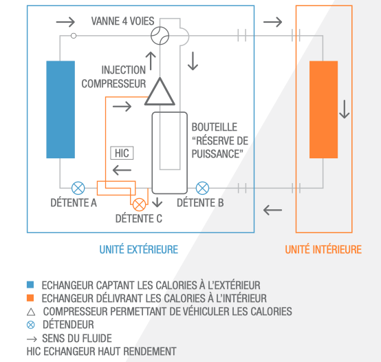 L'injection d'un mélange liquide/gaz au niveau du compresseur (variable de 100° gaz à 100% liquide) permet d'obtenir une température de refoulement maîtrisée et un débit massique suffisant pour que le système soit capable de délivrer une puissance de chauffage constante de +7°C à -15°C à l'extérieur.